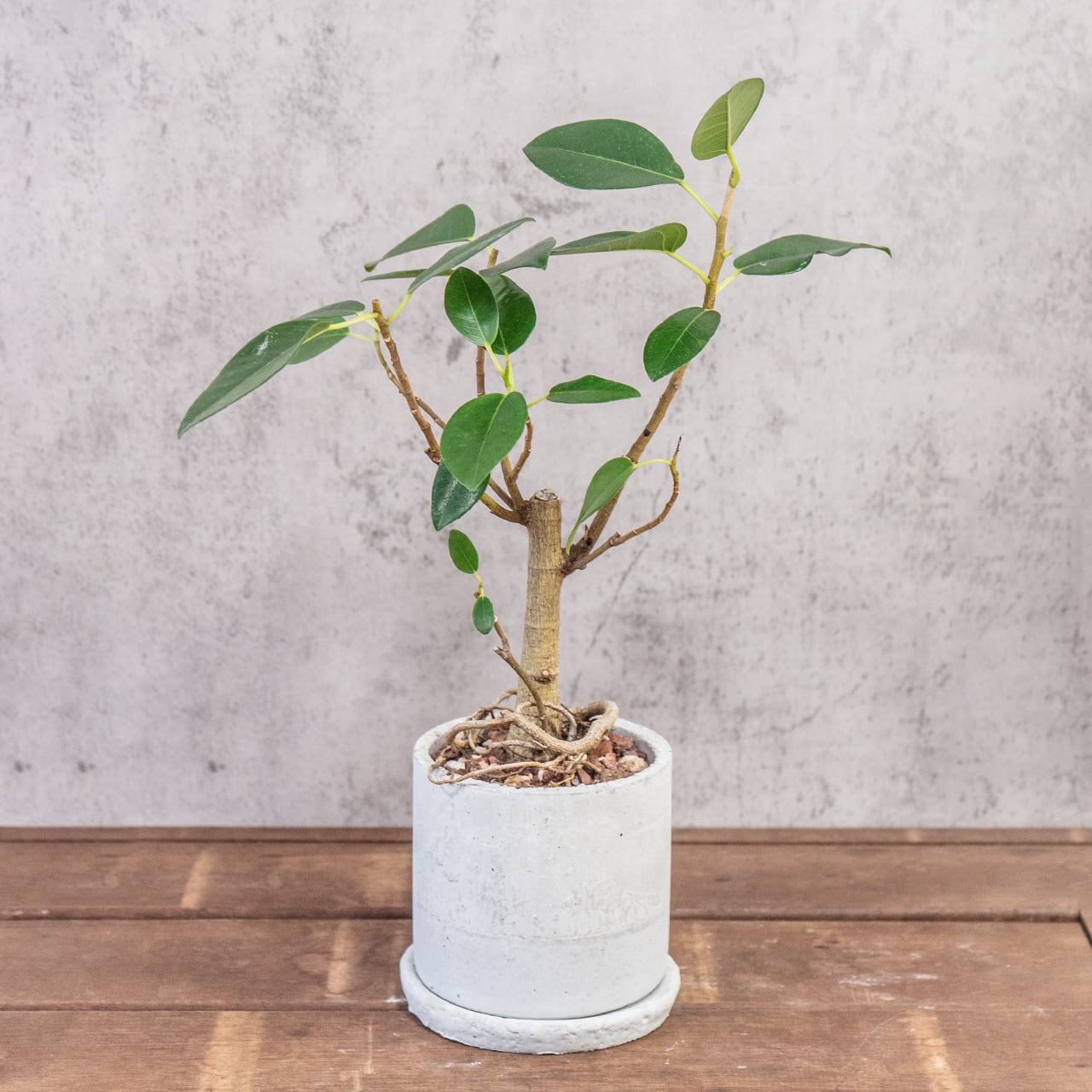 立ち姿が美しいフランスゴムの木|根の表情を楽しむ観葉植物|自作モルタル鉢の一点
