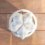 星屑のような白斑模様と、ふっくら膨らんだフォルムが特徴で、年月を重ねた株ならではの存在感があります。株元にはレンガチップをあしらい、自然な雰囲気に仕立てました。