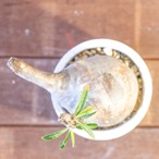 鉢は、当店オリジナルの手づくりモルタル鉢。 多孔質で通気・透水性に優れたモルタル素材は、土が乾きやすく根腐れを防ぐため、塊根植物が健やかに育つ理想的な環境を整えてくれます。 無機質なモルタルの風合いが、グラキリスの野生味を引き立て、落ち着いたモダンな空間にも心地よく馴染みます。