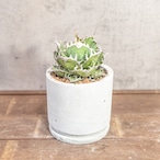 アガベ・チタノタの中でも最高峰の気品と迫力を備えた「シーザー」。その名の通り、凱旋する王者の如く、長く鋭く、そして波打つようにうねる白い強棘(きょうし)が、密集して内側へと抱え込まれる姿は圧巻です。 コンパクトに凝縮された力強いフォルムと、白棘の美しさは、無骨なモルタル鉢と組み合わさることで、洗練された「飾れるアート」としての価値を放ちます。